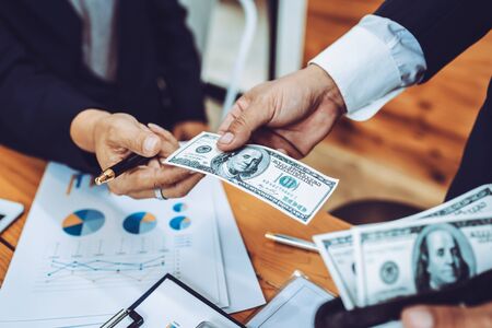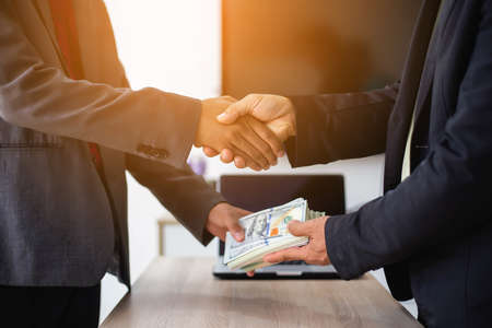 Photo of Businessmen shaking hands and dollar note, sign a contract to bribe corruption in the company. The concept of bribery and corruption.