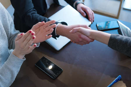 Above view of married couple and friendly realtor shaking hands after making real estate deal indoors, above view.