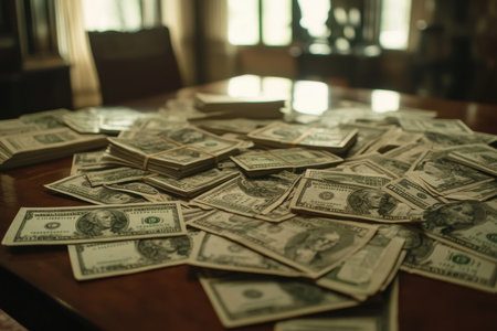 A large collection of U.S. currency lies scattered on a polished wooden table. Sunlight filters through windows, illuminating the money's intricate details and texture.