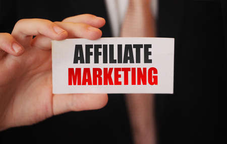 Affiliate Marketing card in male hands. Business concept.