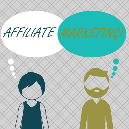 Conceptual hand writing showing Affiliate Marketing. Concept meaning compensation to thirdparty publishers to generate leads Bearded Man and Woman with the Blank Colorful Thought Bubble