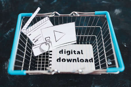 creative content sold online conceptual image, photo and video digital downloads icon in shopping basket
