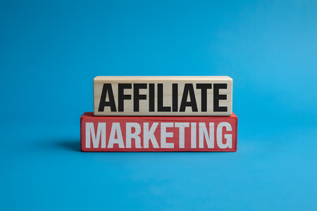 Minimalist affiliate marketing blocks on vibrant blue background, featuring 'AFFILIATE' in black wood and 'MARKETING' in white on red wood, sharp contrast design.