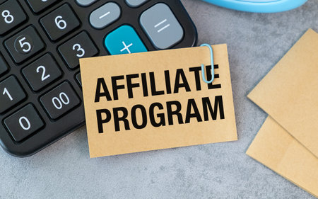 A calculator sits on a table with a piece of paper that says Affiliate Program. The calculator is black and silver