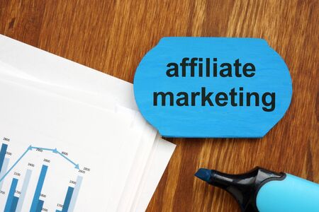 Text sign showing affiliate marketing. The text is written on a small wooden board. Graphs on the paper sheet, markers, wooden background are on the photo.