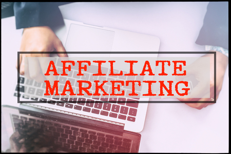Hand and text AFFILIATE MARKETING with vintage background. Technology concept.