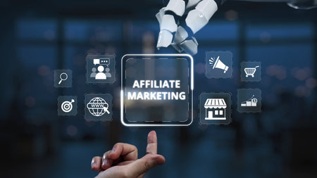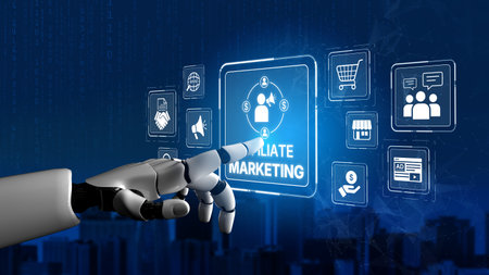 A robotic hand interacts with visual elements of affiliate marketing, illustrating the blend of technology and online business strategies in today digital landscape. Synapse