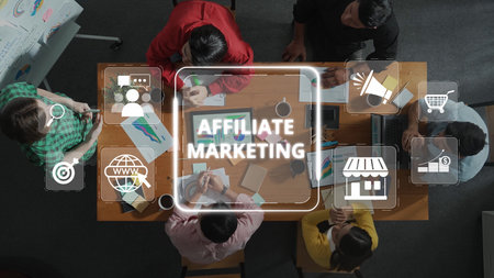 A top-down view captures a diverse group of professionals engaged in a collaborative meeting discussing affiliate marketing strategies with digital icons illustrating concepts. Raster