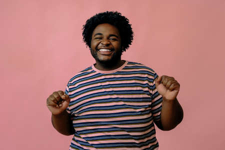 Cheerful dark-skinned girl smiling broadly, rejoicing at her victory in competition among young writers, standing isolated gray wall background.