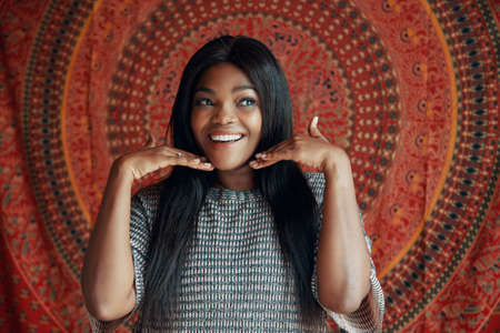 Beautiful smiling young african woman relaxing indoors