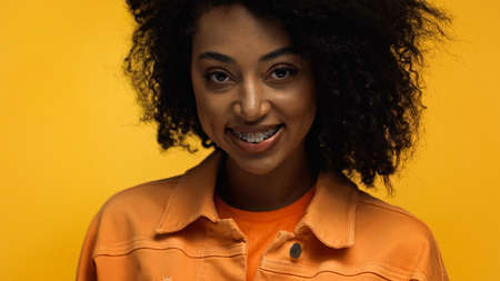 positive african american woman with braces smiling isolated on yellow