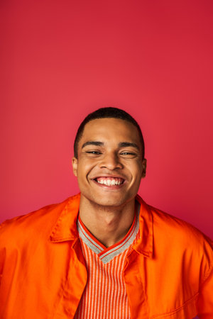 optimistic african american man smiling at camera on red background, orange shirt, portrait
