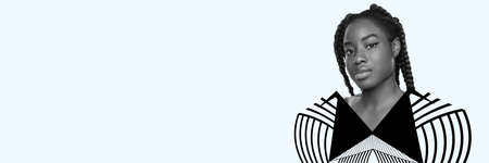 Creative design. Young beautiful african woman with drawn cloth element isolated over light mint background. Flyer