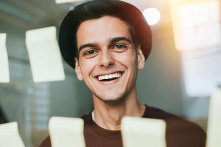Man in front of sticky notes wall created - ai