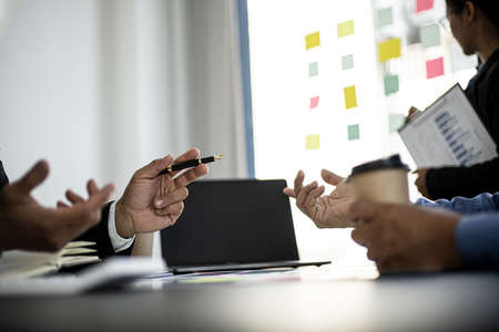 The atmosphere in the meeting room where businessmen and business partners are meeting together, meeting summaries and brainstorming to make the company grow more. Concept of business administration.
