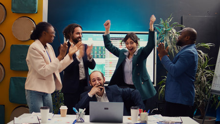 Business people proficiently celebrate project success at office workplace . Corporate business team collaboration concept .
