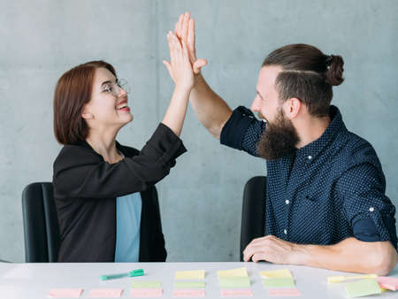man and woman giving high five sitting at table in office. teamwork success and cooperation