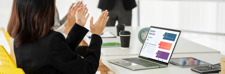 Group of businesspersons feeling happy and cheering successful work on screen