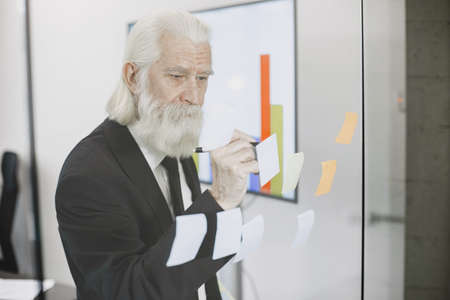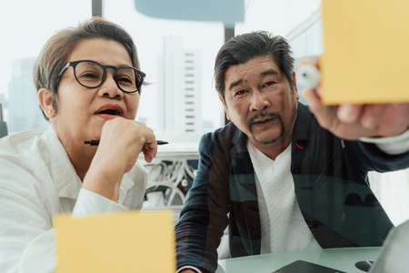 Old elderly senior business people working together in office, pointing at memo sticky note.
