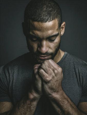 Praying man meditating with hands joined and eyes closed in dramatic lighting