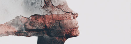 A unique silhouette merges seamlessly with rough, textured wall elements, symbolizing the connection between human identity and environmental influences.