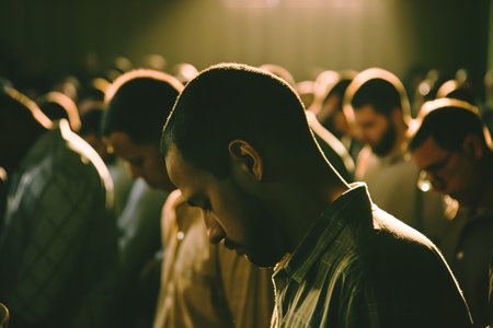 In a dark room, a man stands with eyes closed as a single beam of light shines on his face. This moment captures a profound sense of hope amidst the surrounding darkness, emphasizing resilience.