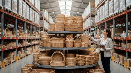 A variety of handcrafted wicker baskets and pottery line wooden shelves in a rustic shop. The warm tones of the materials create an inviting atmosphere, showcasing unique artisan craftsmanship and home styling options.