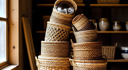 Neatly arranged woven baskets filled with soft textiles on rustic shelves create a cozy home decor atmosphere, offering inspiration for organization and aesthetic design choices.