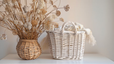 A beautiful dried bouquet in a wicker vase and an empty wicker basket with a cloth on a white background. Soft beige and brown colors of nature. Home interior decor. Still life photography.
