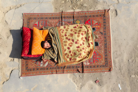 City Streets: Homeless Man Relaxing on Sidewalk Mat