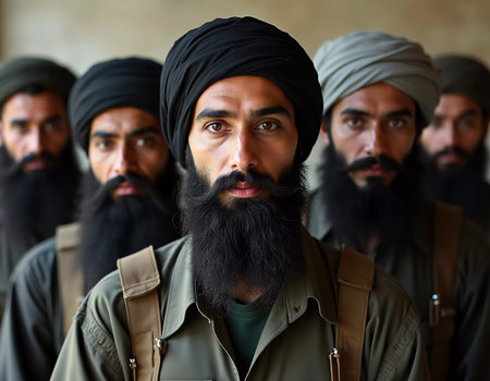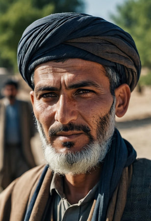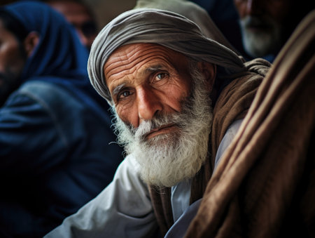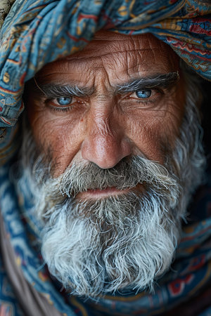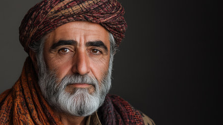 A distinguished-looking man with a gray beard and a colorful turban gazes thoughtfully into the distance. His traditional attire highlights the rich cultural heritage, set against a softly lit background that emphasizes his expressions and character.