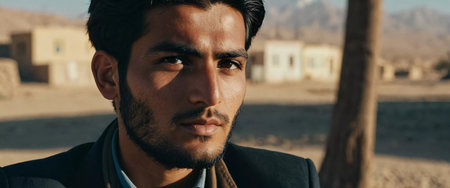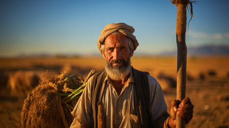 A middle-aged 45 years old Afghan man stands confidently in a rural area, showcasing his traditional attire and thoughtful gaze amidst a serene backdrop of his village. Generative AI.