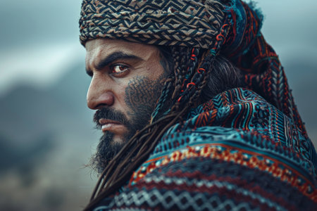 A bearded man in a headdress gazes into the horizon, his presence exuding wisdom and power.