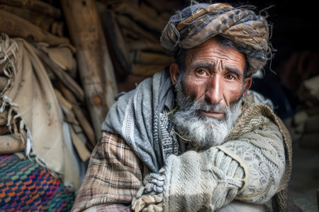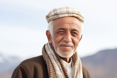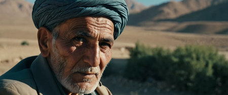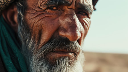 An elderly man from Afghanistan showcases his weathered face, reflecting years of wisdom and resilience against a modest backdrop of nature, embodying the rich culture of his homeland. Generative AI.