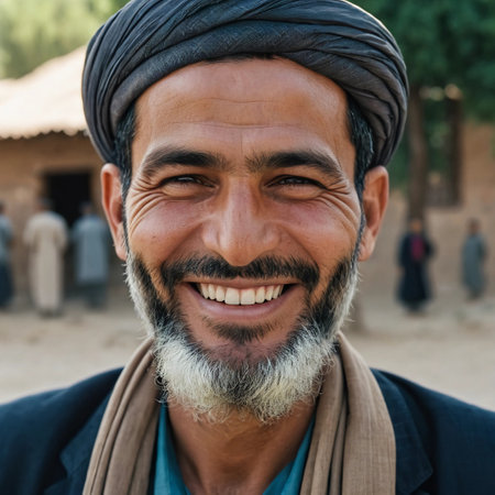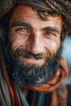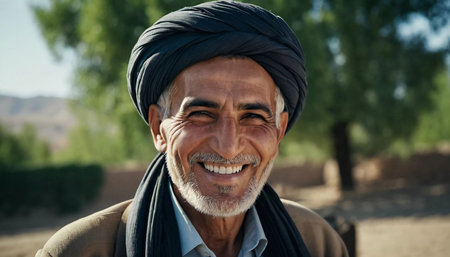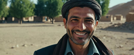 A resident of Afghanistan, this smiling man radiates warmth and happiness, displaying a rich cultural heritage while embracing life. His genuine expression reflects the beauty of his surroundings. AI.