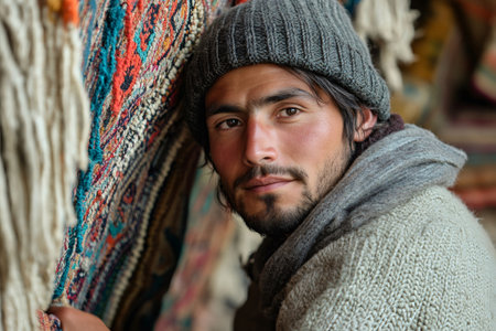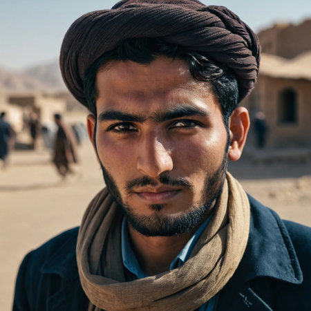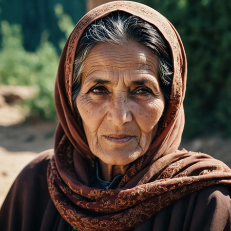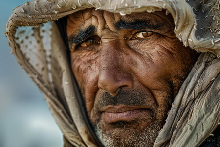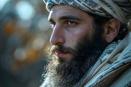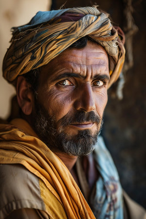 Closeup portrait of a bearded man with thoughtful expression, wearing a patterned headscarf and traditional attire, illuminated by soft natural light with a blurred bokeh background