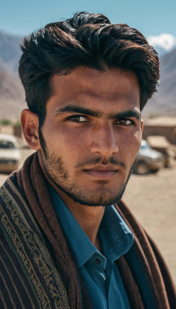 A young man 25 years old from Afghanistan, wearing traditional clothing, poses proudly in his village with mountains in the background, showcasing his cultural heritage. Generative AI.