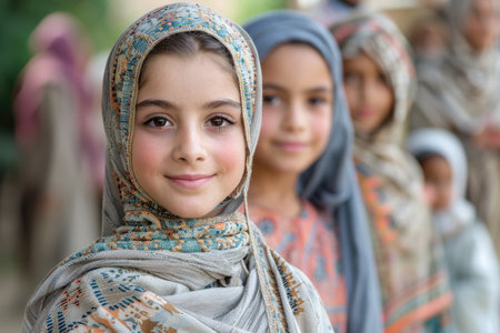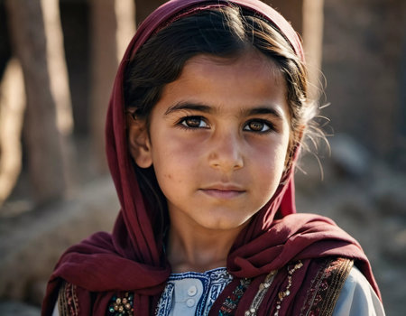 A young girl from Afghanistan stands confidently, showcasing her traditional attire, her expressive eyes reflecting her surroundings and culture. Generative AI.