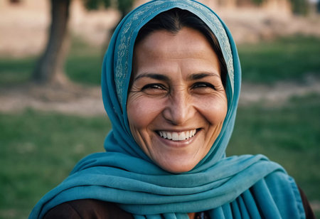 A joyful woman 45 years old from Afghanistan displays a bright smile while wearing traditional clothing. She stands confidently, embodying a sense of peace in her rural community. Generative AI.