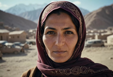 A woman 45 years old in Afghanistan stands confidently, wearing a beautifully patterned scarf. The mountainous landscape emphasizes her strength and connection to her heritage. Generative AI.