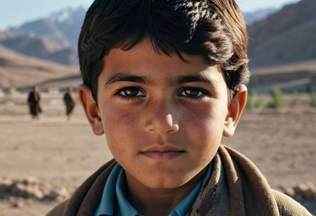 A young boy from Afghanistan gazes directly at the viewer with a calm demeanor, embodying the spirit of childhood amidst a simple rural background. Generative AI.
