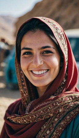 A woman from Afghanistan beams with joy, showcasing her warm smile. Dressed in traditional attire, she represents the vibrant culture of her community, radiating positivity. Generative AI.