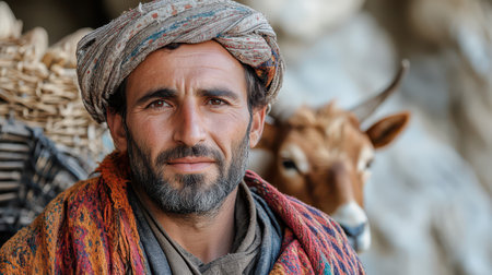 A man with a beard and traditional attire stands in a rural area with a cow nearby reflecting local culture and lifestyle.