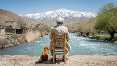 An older man sits on a wooden chair with a dog, facing a river and mountain range. The image shows a serene composition with natural light and a clear blue sky. The scene appears to be outdoors, in a rural environment. This image could be used for editorial or commercial purposes.