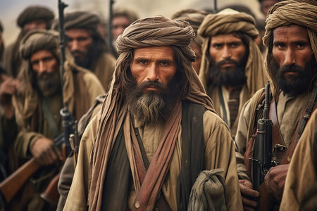 A group of Taliban soldiers stood together, their hardened expressions etched with the weight of their cause. In their eyes, a mix of determination, camaraderie, and allegiance. A solemn portrait capturing the complexities of their shared journey in a world engulfed by conflict. Generative AI