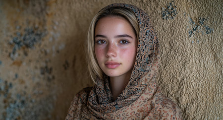 Young woman 25 years old, draped in a beautifully patterned scarf, appears contemplative at a community gathering in Afghanistan. Her expression reflects a mix of strength and serenity. Generative AI.