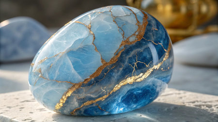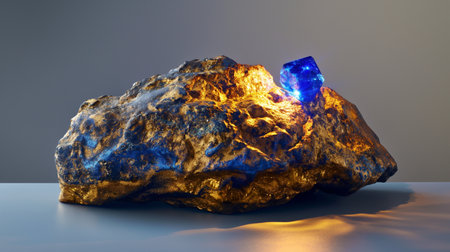 blue and gold marble piece with rough edges, set on a silver surface. this unique artifact showcases the fusion of gold and aquamarine, representing the online culture. the raw energy captured in this image is enhanced by focus stacking, resulting in a bold-graphic composition. the combination of light cyan and yellow adds vibrancy to the overall aesthetic. ai generated