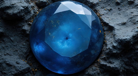 A stunning close-up of a blue gemstone showcasing its intricate facets and vibrant color. The stone rests on a textured dark surface, creating a dramatic visual contrast.
