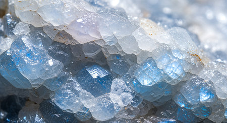 Detailed macro of translucent blue and white crystals. Bright light illuminates faceted surfaces, creating sparkling reflections and an icy, ethereal texture. Natural mineral beauty.