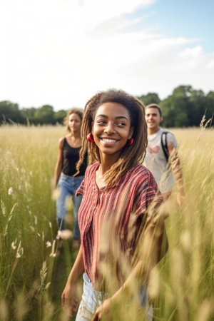 a young woman walking through a field with her friends, created with generative ai